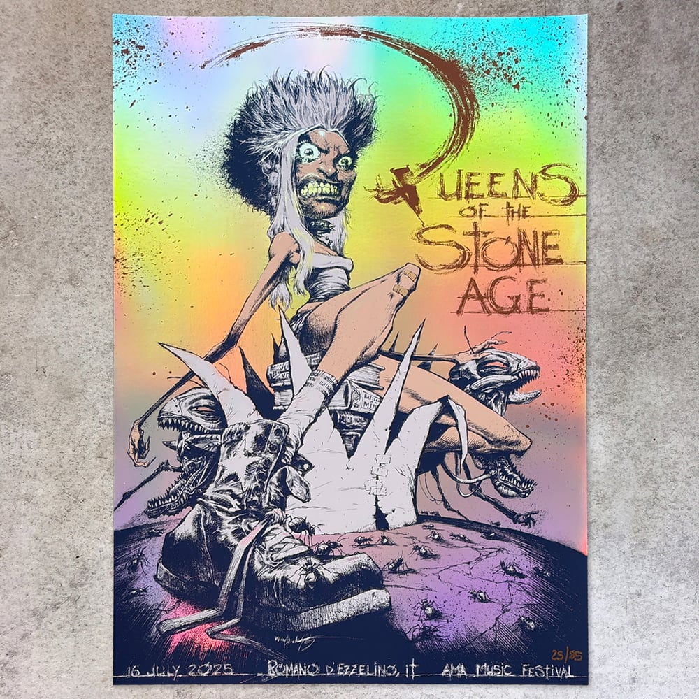 Official poster for Queen of the Stone Age's July 16th, 2025 show in Romano d’Ezzelino, Italy. Posters measure 16.5" x 23.4" (standard A2 frame size) each.